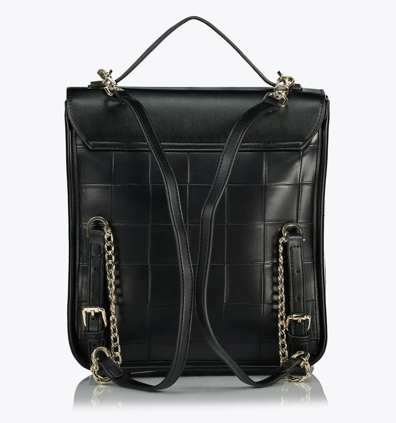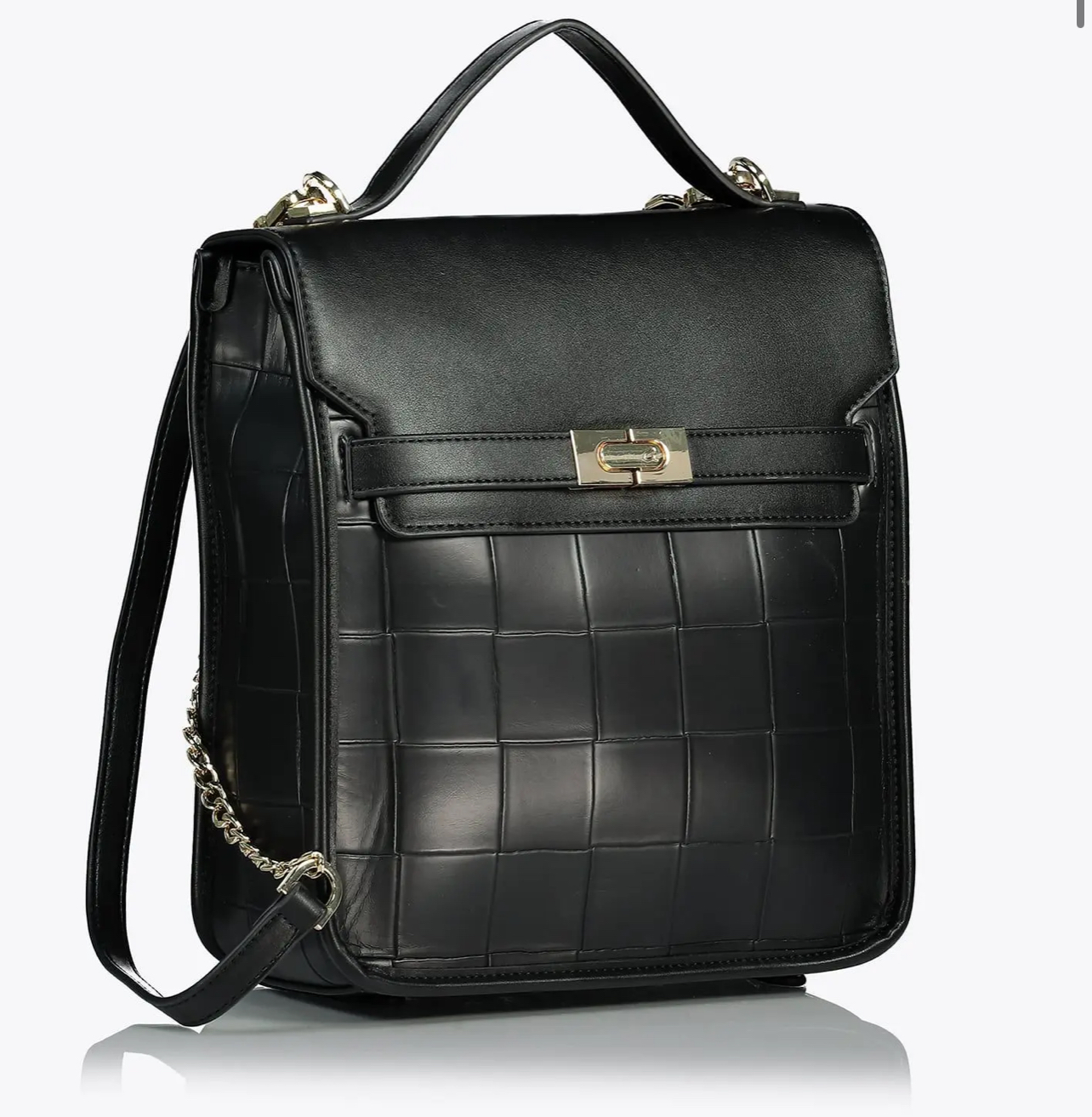 Σακίδιο πλάτης που κλείνει με καπάκι και μεταλλικό κούμπωμα. Διαθέτει ρυθμιζόμενα λουράκια πλάτης με αλυσίδα χρυσής απόχρωσης και λαβή χειρός. Εσωτερικά υπάρχει φόδρα και τσέπη με φερμουάρ.